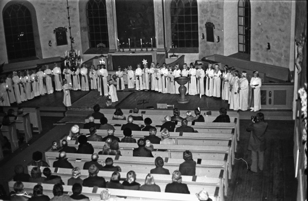 Bildtext: Louise Bröme och Caroline Bröme går Lucia i Ogestad 75 Birgitta Bröme, Ingrid-Märta Bröme, Erik Andersson, Gunnar Forsberg, A Kind, Nils Karlsson, Bertil Haraldsson