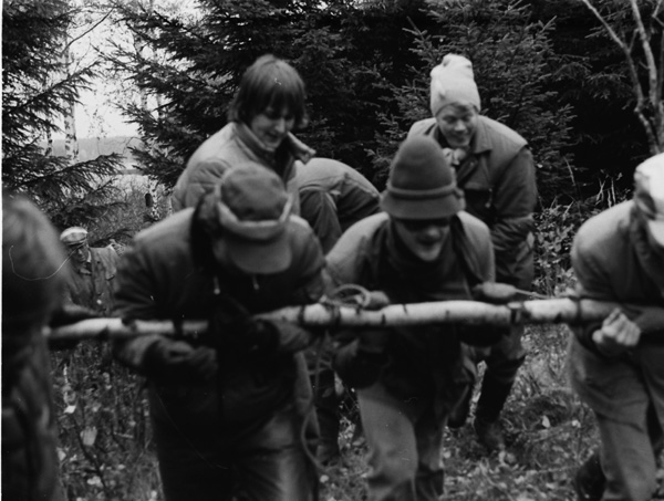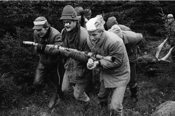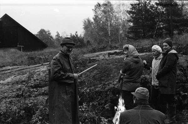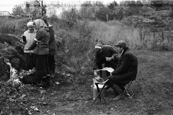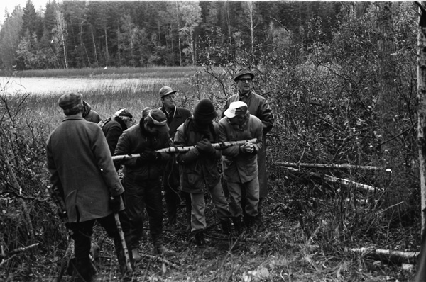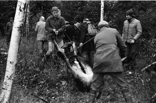 Bildtext: Älgjakt vid Näringe. 761016. Sten Grönhammar. Bilen t.v. är en Simca 1100, tillverkad 1967 - 81 och bilen i mitten är en Citroën GS Kombi (Break), med 4-cylindrig luftkyld boxermotor, tillverkad 1970 - 79. Bilen i bakgrunden t.h. är en Volvo i 140-serien.