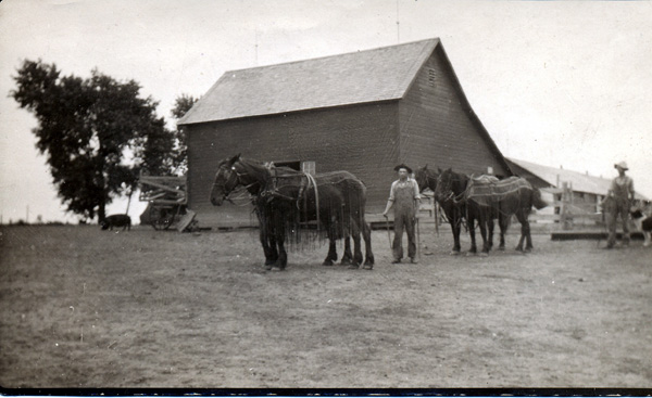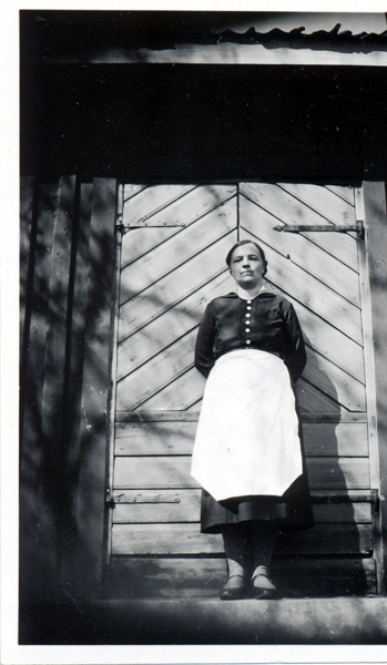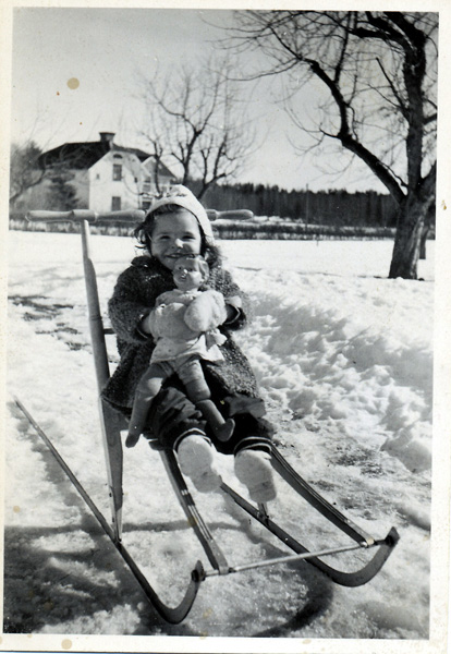 Bildtext: Birgitta Nilsson (Sundström) på spark med en docka i famnen. I bakgrunden syns Solgärde, Karrum.