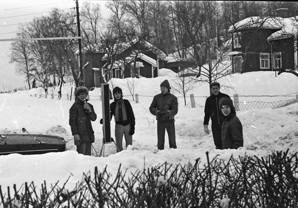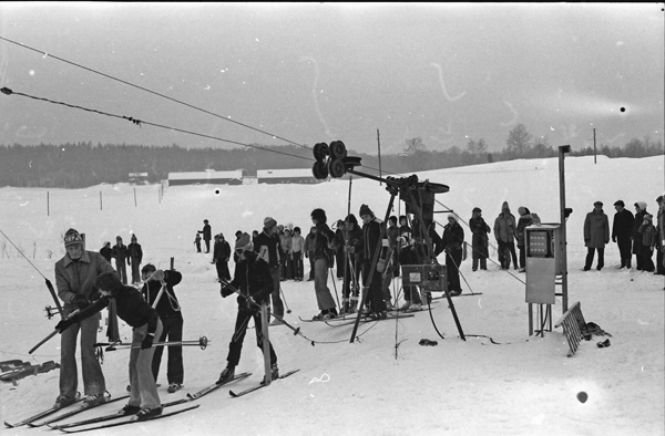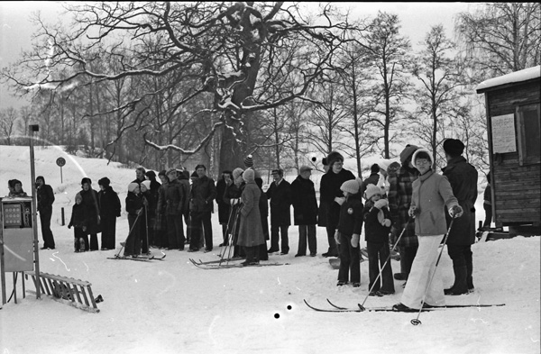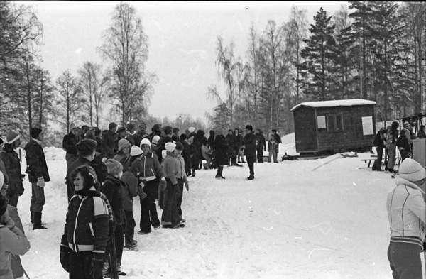 Bildtext: Skidsöndag vid Odenskans 770213 Vid skidliften på Möckelkullen.