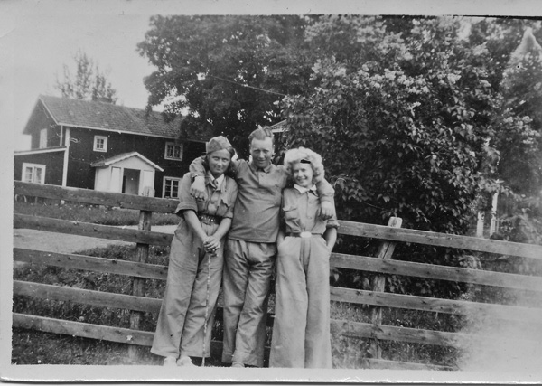 Bildtext: Bild från Kvigestad tagen under krigsåren. Lottor var då inkvarterade i det stora huset och beväringar i det lilla. Strax intill fanns ett flygspaningstorn som var bemannat dygnet runt. Yngve Johansson bonde i Kvigestad, syns i mitten. Den ljushåriga ”Lottan” boende i Linköping har lämnat uppgifter och bild. (saknar namn)
