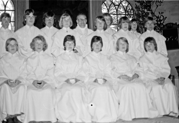 Bildtext: Konfirmation i Odensvi kyrka Pingstafton 770528. Stående Bert Svensson, Tomas Mårtensson, Sune Karlsson, Gunilla Johansson, Klas Törnqvist, Birgitta Henriksson, Peter Sköld, Anders Bröme, Mikael Sand. Sittande Göran Svensson, Roger Andersson, Lena Andersson, Karin Andersson, Lena Thuresson, Johan Berglund. Präst Sven Sand.