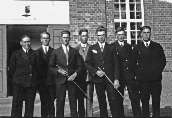 Bildtext: Mulestad. 1. Fru Hildur Olsson (fotografens fru), 2. Lärarinnan Elin Arvidsson, 3. Selma Franzén, Elin Karlsson, Lärarinnan Ingeborg Karlberg