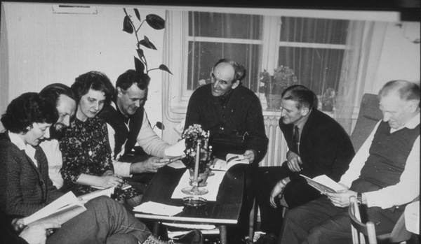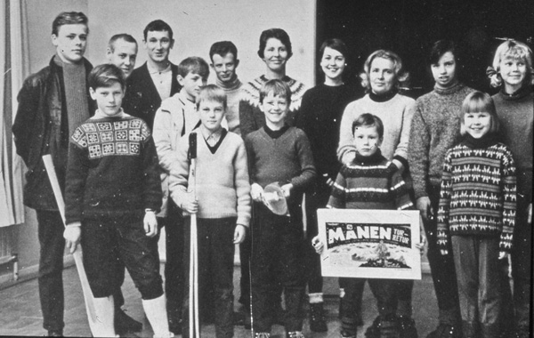 Bildtext: Kommunmästerskapet i Odensvi. Segrarna i de olika klasserna. Bakre raden: NN, Bosse Karlsson, Olof "pajsaren" Johansson, NN, Roland Karlsson, Margot Johansson, Eivor Andersson, Astrid Krapf ?, Gudrun Brage, Lena Hedberg.