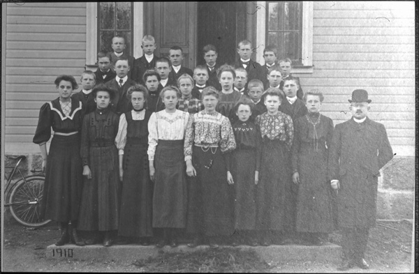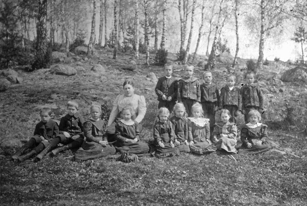 Andra raden: Pontus Andersson, Snällebo, Petrus Blomberg, Tore Karlsson, Kullerstad, Ragnar Svensson, Lilla Skälhem, Lärarinnan Hulda Karlsson, Artur Wessman, Helmer Larsson, Erik Starkenberg, Gustav Andersson, Ernstbo.