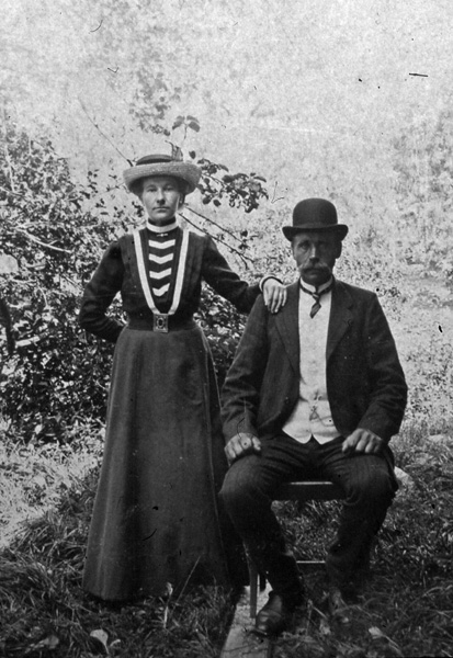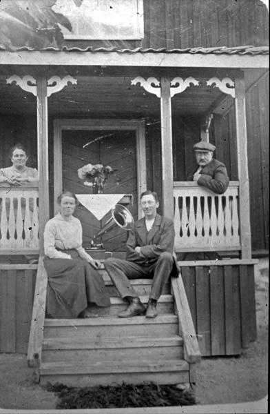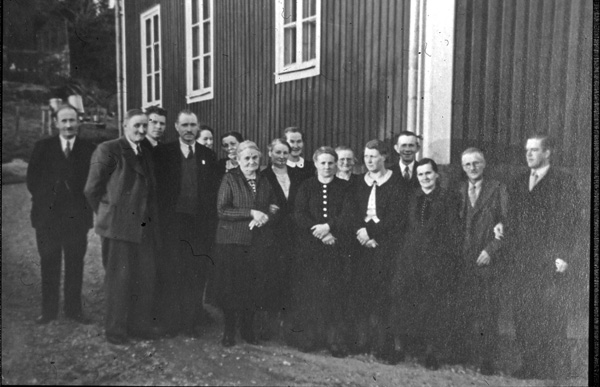 Bildtext: År 1919 på Ogestad. Elev Sture, Emma, Erik Karlsson Odensvi, Charlotta, Emma, lillpojken Karl Wilén, Tage, Einar, Greta Jakobsson, lillpojk Gunnar K, Rut Wilén, Gunhild Karlsson.