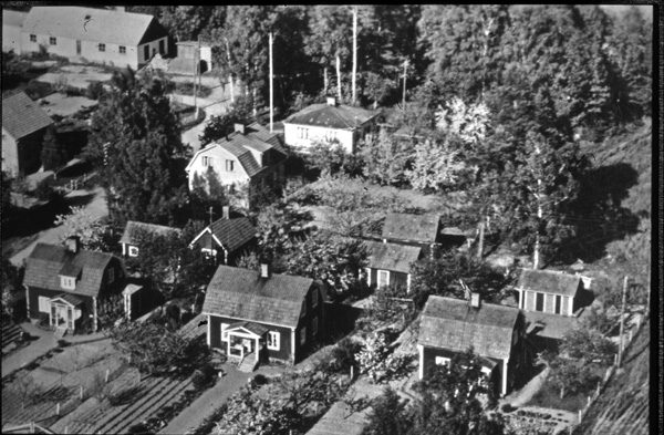 Bildtext: Flygfoto över Odensvi södra samhälle. Observera Wessmans snickeri i hörnet.