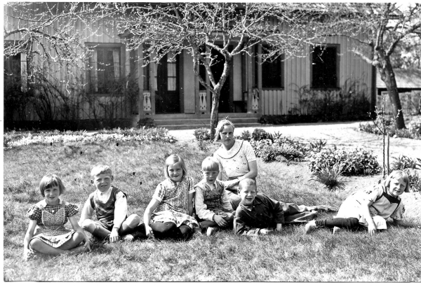 Jonstorp skola ca 1939 Klass1 Fröken Dagmar Qvarnström, Barbro Olofsson, Ogestad, Stig Ivarsson, Ludvigsborg, Britta Nilsson, Karrum, Sten-Olof Johansson, Ogestad, Hartvig Karlsson, Ogestad, Eva Karlsson, Snärsfall