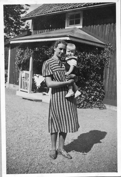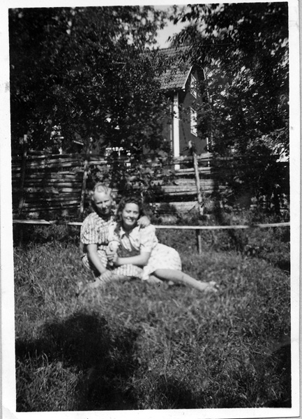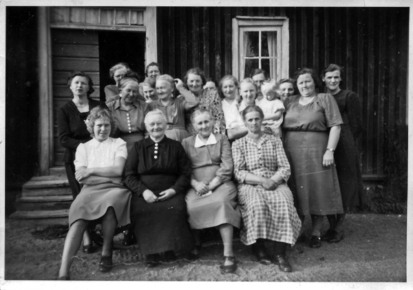 Bildtext: Bild troligen från Klint, Odensviholm. Ester i Havet 3:a i första raden, Ingrid Karlsson i Odensviholm, Anna i rutigt, Dagmar med barnet. Vet någon mer ? ----- Har ett likadant kort. På baksidan står: Selma Bards 60års dag 1949. Selma är den sittande damen i svart klädning. Till höger om henne sitter Agnes, till vänster på bilden, dotter till Oskar och Selma bakom synes Astrid Larsson och Ebba Larsson och även Astrid Bergström. Huset i bakgrunden är Klint Selmas bostad.