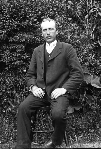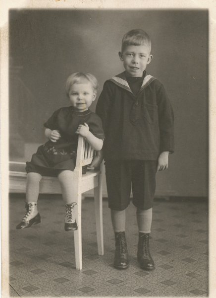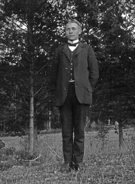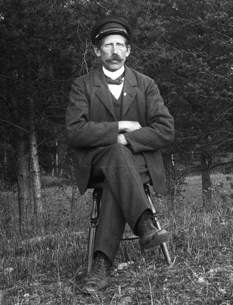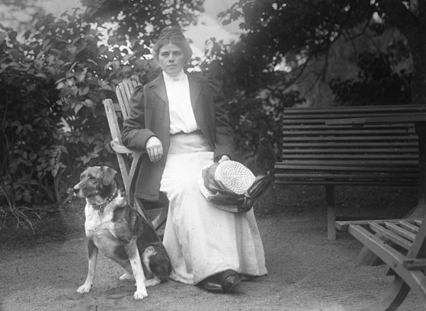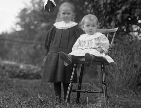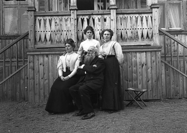 Bildtext: Systrana Ester, Ebba och Rut Olsson i Rutsboo tillsammans med sin far Karl Olsson (Inspektor på Kulla). Karl byggde detta huset och är far till fotografen Erik Olsson, Haga.