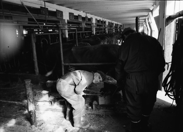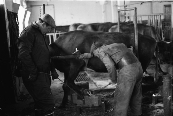 Bildtext: Klövverkning i Ogestad ladugård 760405. Arne Axelsson Talsebo Hycklinge och Gunnar Forsberg