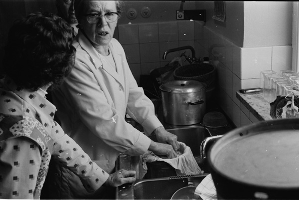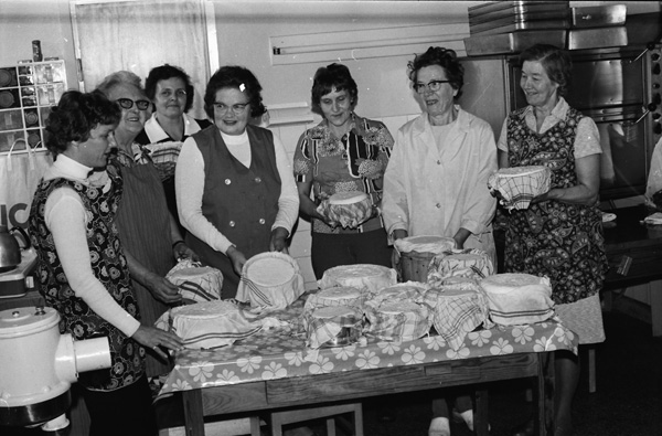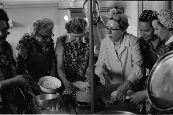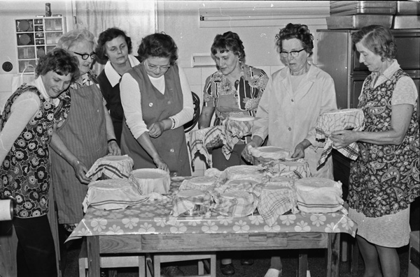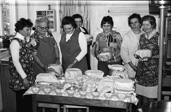 Bildtext: Ystning i Odensvi skola 761009. Ingrid-Märta Bröme, Ogestad Märta Svensson, Hästerum, Svea Svensson, Gölinge, Gulli Nilsson, Möckelhult, Ingegärd Andersson, Möckelhult, Gunborg Lindgren, Odensvi, Valborg Andersson, Odensvi
