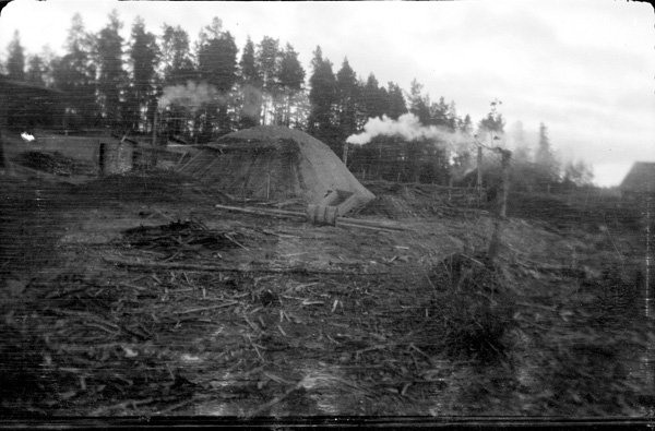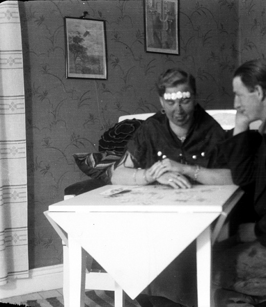 Bildtext: I köket i Hagalund. Kalle Johansson, Amalie Johansson. Flickan kan vara dottern Inga, född 1914? Detta är ett tidigt foto att döma av Kalles utseende, och det skulle stämma med flickans utseende och storlek: 5 - 6 år.
