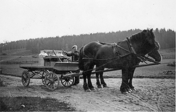 Bildtext: Evert Josefsson, Sågarestugan, på väg till mejeriet med mjölkflaskorna upplastade på vagnen bakom parhästarna. sökord: arbetshästar parsele seldon tömmar hästkörning Sågarstugan mjölkflaskor motivkategori: jordbruk id:15217 Fotograf: okänd fotoår: okänt bildnummer: BIBA035 förening: Odensvi Hembygdsförening land: SE motivplats: Kalmar län, Västervik, Odensvi, Sågarstugan teknik: Skannat sv/v foto rättighet:(föreningen ovan om ej annat anges.) Birgitta Balck, Odensvi originalplats: (visas ej publikt) släktboken: publiceras: ja säljas: tidigare nr: samling: Birgitta Balck, Odensvi, privata bilder skick: reg av: Per-Inge Linderson reg datum: 2026-01-28 |