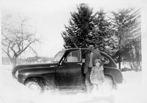 Bildtext: Bror Carlsson i Snärsfall med dottern Birgitta och sin Vanguard. /// Bilen är en Standard Vanguard, en engelsk då nykonstruerad efterkrigsbil med 68 hk fyrcylindrig motor, som i likhet med en del andra bilbilmodeller från Standard Motors vid den tiden hade motorblocket gemensamt med Fergusontraktorns motor. Standard Vanguard hade en rymlig och bred kaross, med ett kort, avrundat bakparti som i Sverige gav den smeknanmnet "Pelle Svanslös". Den tillverkades 1947- 1963 och i Sverige, där den blev tämligen populär, monterades den hos generalagenten ANA i Nyköping. -- Informationen från Bo Johansson sökord: vinterbild snödriva vinterväglag motivkategori: transport id:15208 Fotograf: okänd fotoår: ca 1956 bildnummer: BIBA047 förening: Odensvi Hembygdsförening land: SE motivplats: Kalmar län, Västervik, Odensvi, Snärsfall teknik: Skannat sv/v foto rättighet:(föreningen ovan om ej annat anges.) Birgitta Balck, Odensvi originalplats: (visas ej publikt) släktboken: publiceras: ja säljas: tidigare nr: samling: Birgitta Balck, Odensvi, privata bilder skick: reg av: Per-Inge Linderson reg datum: 2026-01-26 |