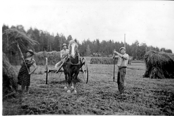 Bildtext: Härlig bild från högärdet där hässjorna är på väg upp. Höet strängas med en hästräfsa. En man står med spettet i högsta hugg för att göra hål för fler krakar. Kvinnan med hatt sätter upp höet på hässjan med högaffeln. I bakgrunden syns redan uppsatta hässjor. Troligen Norra Stenserum men kan vara Stora Spånga i Hallingeberg. sökord: höåker höskörd hotstång strängläggare räfspinnar motivkategori: jordbruk id:15136 Fotograf: okänd fotoår: okänt bildnummer: INOS120 förening: Odensvi hembygdsförening land: SE motivplats: Kalmar län, Västervik, Hallingeberg, Stenserum teknik: Skannat sv/v foto rättighet:(föreningen ovan om ej annat anges.) Ingela Österling, Fågelrum originalplats: (visas ej publikt) släktboken: Ingela Österling, Fågelrum publiceras: ja säljas: tidigare nr: samling: Ingela Österling, Fågelrum, Privata bilder skick: reg av: Per-Inge Linderson reg datum: 2025-09-12 |