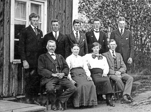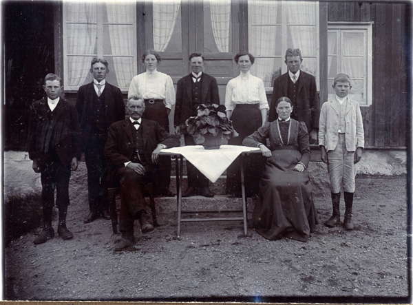 Bildtext: Bild från Norra Stenserum: Sven, Sigfrid, Erik, Rickard, Ivar Frans, Matilda (mamma & pappa) Märta (sonhustru), David. Helga Samuelsson saknas på bilden. ------------ Bakre rad: 1) SVEN Valentin Gustafsson f. 1 feb 1898 2) Gustaf SIGFRID Månsson f. 10 feb 1885 3) ERIK Olof Verner Gustafsson f. 16 jul 1904 4) Axel RICKARD Gustafsson f. 1 mar 1900 5) Karl IVAR Gustafsson f. 20 okt 1902 Främre rad: 1) FRANS Oskar Gustafsson f. 13 jul 1866 (Gärdserum) 2) MATILDA Charlotta Svensdotter f. 18 jan 1860 3) MÄRTA Charlotta Elisabet Andersson f. 21 apr 1893 4) DAVID Oskar Valdemar Gustafsson f. 16 dec 1895 Fader till nr 2 (i Matildas första gifte) är Axel Frans Oskar Månsson f. 20 mar 1854 i Hycklinge. (De hade även döttrarna Elin och Hildur Månsson). sökord: syskon släktbild motivkategori: personer id:15128 Fotograf: okänd fotoår: okänt bildnummer: INOS486 förening: Odensvi hembygdsförening land: SE motivplats: Kalmar län, Västervik, Hallingeberg, Stenserum teknik: Skannat sv/v foto rättighet:(föreningen ovan om ej annat anges.) Ingela Österling, Fågelrum originalplats: (visas ej publikt) släktboken: Ingela Österling, Fågelrum publiceras: ja säljas: tidigare nr: samling: Ingela Österling, Fågelrum skick: reg av: Per-Inge Linderson reg datum: 2025-09-11 |