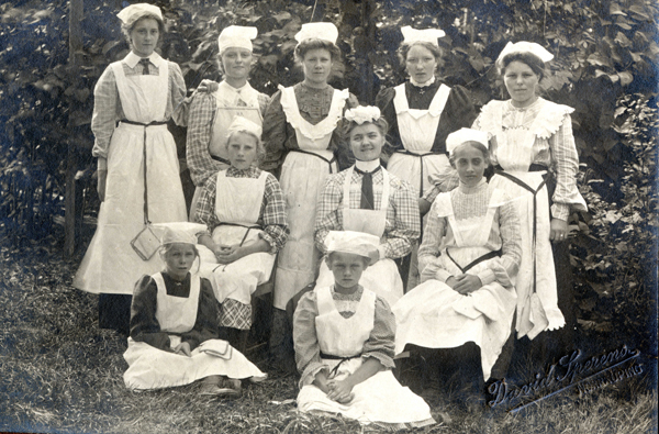 Bildtext: Skolkök. Helga Gustafsson, Stenserum, född 6/10 1894, mamma till Ingrid Samuelsson, 1:a i mittersta raden från vänster. sökord: skolkök, utbildning kokkonst matlagning förkläde grytlappar motivkategori: kvinnor id:15129 Fotograf: David Sperens, Norrköping fotoår: okänt bildnummer: INOS526 förening: Odensvi hembygdsförening land: SE motivplats: Kalmar län, Västervik, Hallingeberg, Stenserum teknik: Skannat sv/v foto rättighet:(föreningen ovan om ej annat anges.) Ingela Österling, Fågelrum originalplats: (visas ej publikt) släktboken: Ingela Österling, Fågelrum publiceras: ja säljas: tidigare nr: samling: Ingela Österling, Fågelrum skick: reg av: Per-Inge Linderson reg datum: 2025-09-11 |