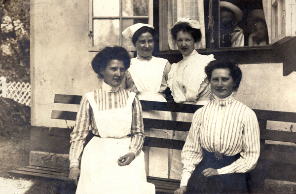 Bildtext: Foto från Disavägen 3 i Djursholm, Stockholm. Bakom soffan till vänster står ELIN Axelina Månsson född 31 okt 1880 i Norra Stenserum, tjänarinna hos familjen Rydbeck i Djursholm. På soffan till höger sitter hennes syster HILDUR Matilda Månsson född 23 feb 1883 i Norra Stenserum, Hallingeberg. Hildur var anställd hos familjen Rydbeck från 1903 men under åren 1920-1929 bodde hon i centrala Stockholm på Västeråsgatan 3 / Västmannagatan 94, och arbetade då som sömmerska. Hon började åter arbeta hos Rydbeck 1929, och då hade familjen flyttat från Disavägen 3 till fastigheten Gamla Djursholm nr 1. I fönstret syns familjens barn, Bengt Rydbeck f. 1903 och Ingrid Rydbeck f. 1905. De andra två kvinnorna är okända. /// Info från Annika Ekström sökord: hembiträde hushållerska tjänstekvinna tjänstepersonal Ellen Månsson Hildur Månsson motivkategori: kvinnor id:15175 Fotograf: okänd fotoår: okänt bildnummer: INOS519 förening: Odensvi hembygdsförening land: SE motivplats: Stockholm, Djursholm teknik: Skannad sv/v foto rättighet:(föreningen ovan om ej annat anges.) Ingela Österling, Fågelrum originalplats: (visas ej publikt) släktboken: publiceras: ja säljas: tidigare nr: samling: Ingela Österling, Fågelrum, Privata bilder skick: reg av: Per-Inge Linderson reg datum: 2025-09-18 |