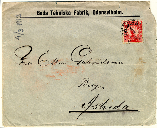 Bildtext: Ett kuvert med förtryckt Boda Tekniska Fabrik, Odensviholm. Det är poststämplat Odensviholm 4/3 1912. Den kemiska fabriken drevs av Erik Ohlsson i Haga, Boda och där tillverkades bl.a. beck. Erik var även en verksam fotograf. Brevet är skickat till Ellen Gabrielsson som var farmor till Kerstin Dahlström i Mönsterås, och syster till Eriks fru Hildur. sökord: Kuvert frimärke postsändelse stämplat motivkategori: föremål id:15169 Fotograf: Per-Inge Linderson, Jonstorp fotoår: okänt bildnummer: PiL_KEDA102l förening: Odensvi hembygdsförening land: SE motivplats: Kalmar län, Västervik, Odensvi, Boda teknik: Skannat föremål rättighet:(föreningen ovan om ej annat anges.) Per-Inge Linderson, Jonstorp originalplats: (visas ej publikt) släktboken: publiceras: ja säljas: tidigare nr: samling: Per-Inge Linderson, Jonstorp skick: reg av: Per-Inge Linderson reg datum: 2025-09-15 |