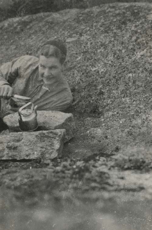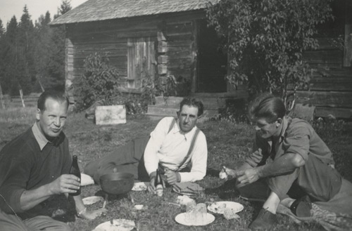 Bildtext: Till höger Erik Bergman med sin hund. Delsbo IF skidsektion eller Skid och Friluftsfrämjandets utflykt till Lillvallen våren mars-april 1941