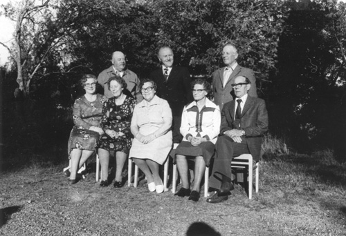 Bildtext: Kort från (JG) Jonas Gustaf Baggströms (1874-1963) 75-års dag 1949. Barn,sonhustrur, mågar och barnbarn samlade på trappan i Haga. Övre raden: Valborg Baggström (Gösta) Elin Baggström, Anna Baggström, Märta Baggström (Axel), Axel Baggström, Lasse Hellström (Signe), Gösta Baggström. Mellanraden: Martin Johannisson,(Kristina) Catarina Johannisson, Kristina Johannisson JG, Karin Baggström Erik Baggström. Barnen: Eva Baggström, Jonny Baggström, Sune Baggström, Bertil Baggström,Kerstin Hellström, Birgitta Baggström och Ulla Baggström
