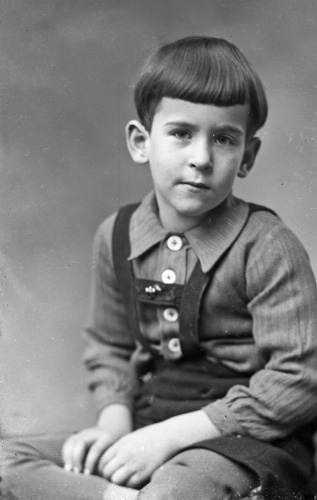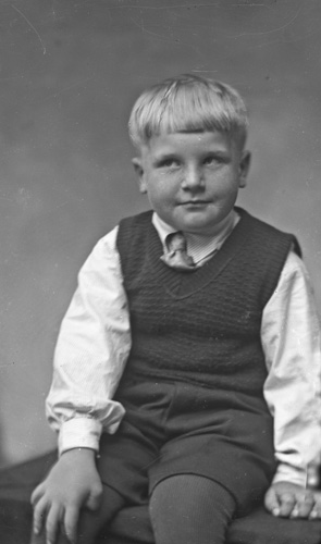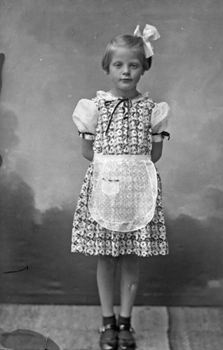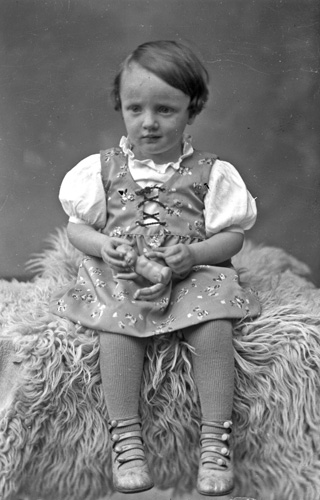 Bildtext: dålig bild på okänd familj framför okänd byggnad. Se även en-ab-132