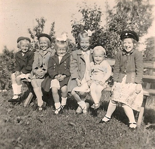 Bildtext: Klara och Per Olsson i Nybo med barnen Ivar, Per-Olov, Nils-Erik, Anna, Ada, Emma, Adolf, Johanna, Helmer Se bildnummer: ep-priv-1. Inkommen bildsynpunkt kompletterar: Minstingen Oskar Helmer är född 20/10 1918. Äldst i barnaskaran var Anna kristina född 1897. Ada/1900, Per Olof och Emma/1902 som tvillingar, Nils Erik/1904, Johan Ivar/1906, Johanna/1909 samt Adolf född 1913. Pappa Per 1863-1952 samt mamma Klara f.1879. Grängsjö 3 Nybo Enånger sn. Allt enligt kyrboken.