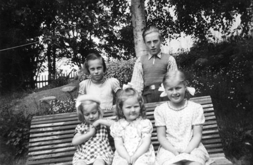 Bildtext: På bron i Wästnång, Finnika. Fv: Kaj Berglund, Lennart Sjödin, Sigrid Westling (i dörröppningen), Kerstin Westling (Larsson), Göta Sjödin och Sven Westlings döttrar Gunilla och Monica