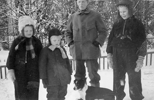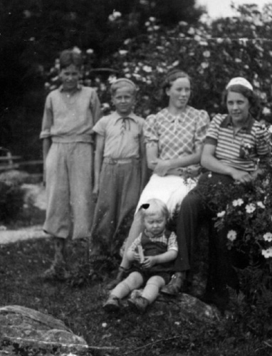 Bildtext: Från vänster: Gunnar Hedlund, Erik Åkerlund, Greta Hedlund, Irene Burman. Barnet är Bengt Åkerlund