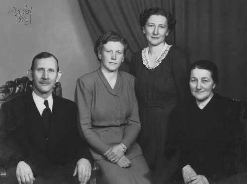 Bildtext: Fv: Margit Eriksson, Rune Holmqvist, Astrid Holmqvist, Lena Eriksson, Bertil Holmqvist, Anna Holmqvist, Ann-Mari Holmqvist, Irene Eriksson, okänd. Platsen är Vitsand i Essvik