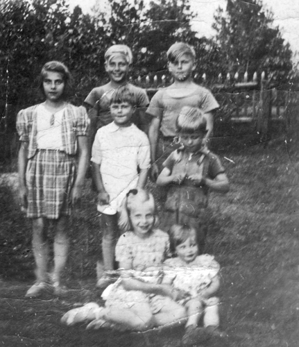 Bildtext: Ada Johansson (från Rössånger) med barn och deras familjer. Främre rad fv: Anni Westling, Kerstin Bergström, Bibbi Westling, Maj-Britt Johansson. 2:a rad: Stig Johansson, Ada Johansson, Yngve Westling, Eje Bergström, Håkan Bergström (skymd). 3:e rad: Gunnar Johansson, Gunhild Löjdström, Elin Johansson, Märta Bergström. Övre rad: Hilma Edbrink, John Edbrink, Astrid Westling, Otto Bergström, Sigfrid Löjdström, Johan Westling