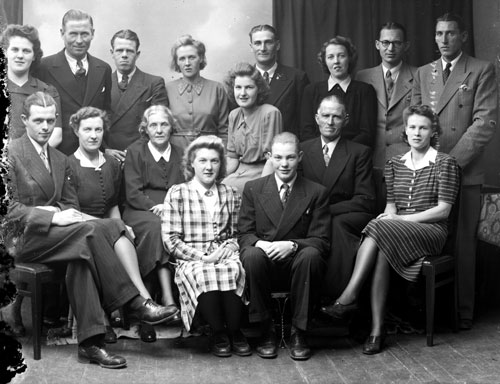 Bildtext: Detta är fam Vilhelm Bergman, barn med respektive. Överst fv Märta, Isidor Enbom, Gunnar Bergman, Ingrid Bergman g Roos, Helge Roos, Rut Bergman g Ström, Kalle Ström, Bengt Jansson. Främre rad: Oscar Bergman, Ingeborg Enbom f Bergman, Ida Bergman, Ellen, Margit Westberg, John Bergman, Ville Bergman, Signe Jansson