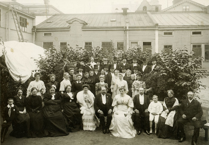 Bildtext: Sjölins, Bröllop, Brudparet P Wiklander o Ingrid. På innergården vid ungefär nuvarande Intersport. 2:a raden 4:a, Johanna "Hanna" Sjölin.