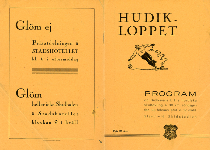 Bildtext: Sjölins, Program, "Hudikloppet på skidor, 30km, 23 febr. 1942."