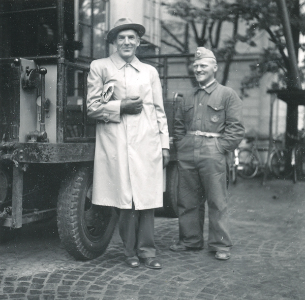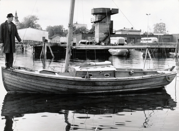 Bildtext: Kattvikskajen, Åke Persson på båten, som är en Saltsjöbadsjulle.I bagrunden ett av två bevakningstorn i betong, som fanns i Hudiksvall.
