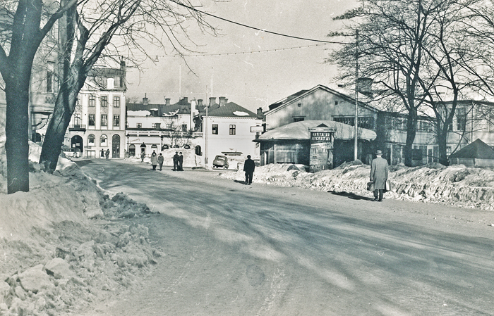 Bildtext: SONERUDS, I låga husdelen bakom annonspelaren (framför cafè Centralparken) började verksamheten 1952 av bröderna John och Gottner Sonerud under firmanamnet " Bröderna Soneruds Maskinförmedling". Gottner hade leksaksaffär i lokalerna tidigare. (tidigare bild från LGL76)