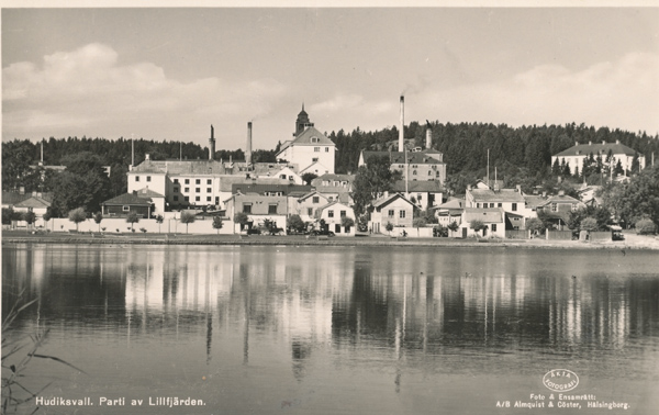 Bildtext: Hudiksvalls hamn sedd från öster med fartyg vid kaj, hamnbangård, tullhus mm. Notera järnvägens smalspår (Bergsjöbanan) till höger och längst till vänster, övriga spår (Ljusdalsbanan) med normal spårvidd. Likadan bild men i svartvitt kan sökas på sökbegrepp HM-VY-1-17
