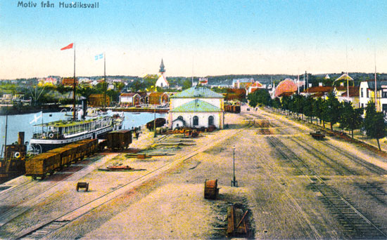Sökord: båtar, fartyg, byggnader, järnvägsvagnar, stadsmiljö, hamn, allé, bangård Motivkategori:sjöfart Id:2348 Fotograf: okänt Fotoår: omkring 1910 Bildnummer: karv-554 Förening: Enångers hembygdsförening Land: se Motivplats: Gävleborg, Hudiksvall Teknik: inskannat kolorerat vykort Rättighet: privat Originalplats: (visas ej publikt)